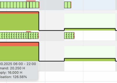 The planning board provides a Gantt chart for clear planning of processes and easy visualisation of dependencies. Capacities, working hours and shifts are displayed directly in the timeline, enabling intuitive planning.